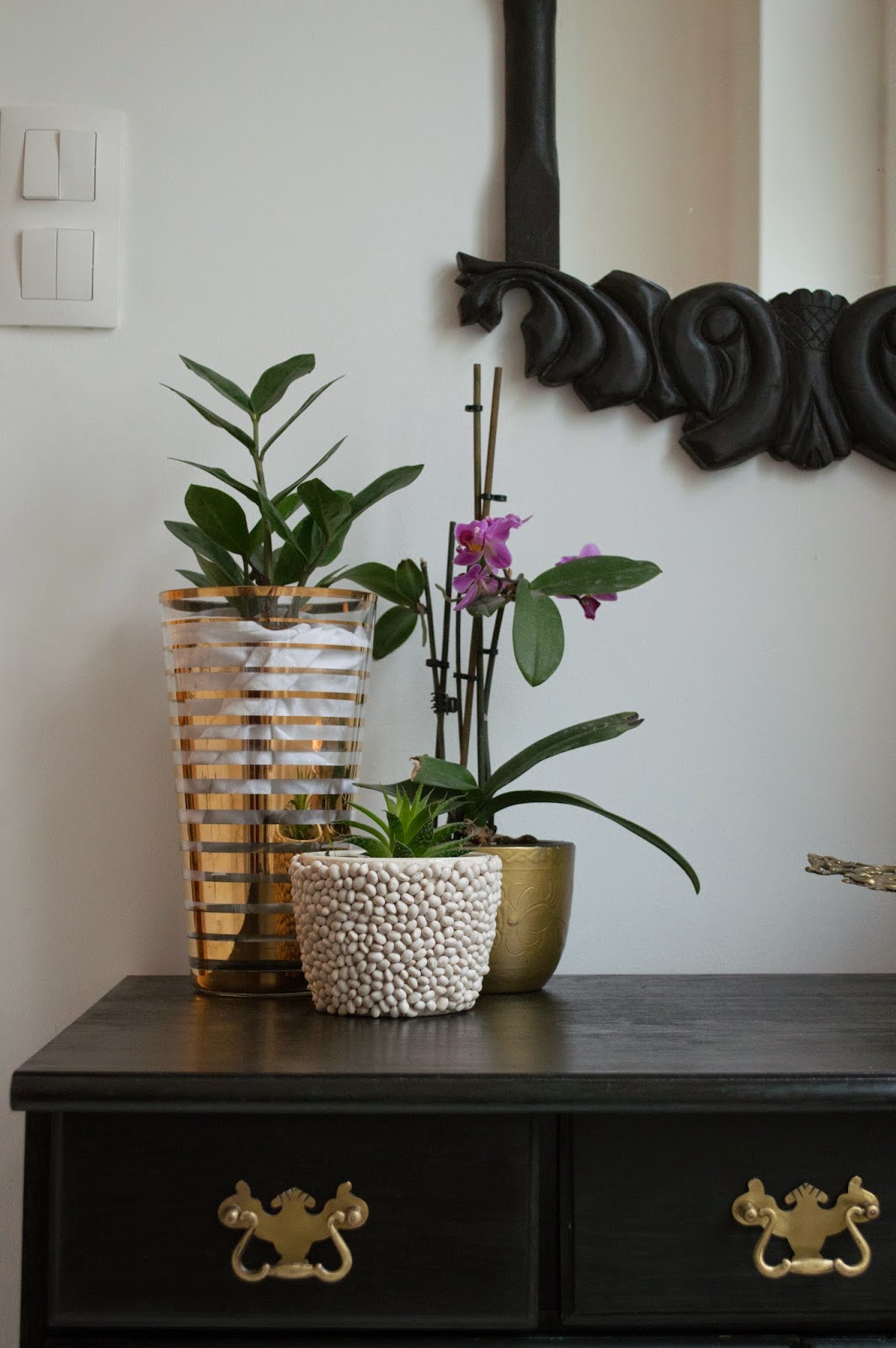 Sokat dolgoztam vele, részben fölöslegesen, de egyrészt mindenki a saját kárán tanul, másrészt az eredmény mindenért kárpótol. Imádom ezt az összhatást, amit szekrény, a tükör, a gyönyörű bolhapiacról származó lámpám, és virágok illetve a réz kiegészítők teremtenek 🙂 Ráadásul tökéletesen elnyeli a cipőim (nagyobb részét), a kulcsot, sapkákat, és hasonló előszobai dolgokat.