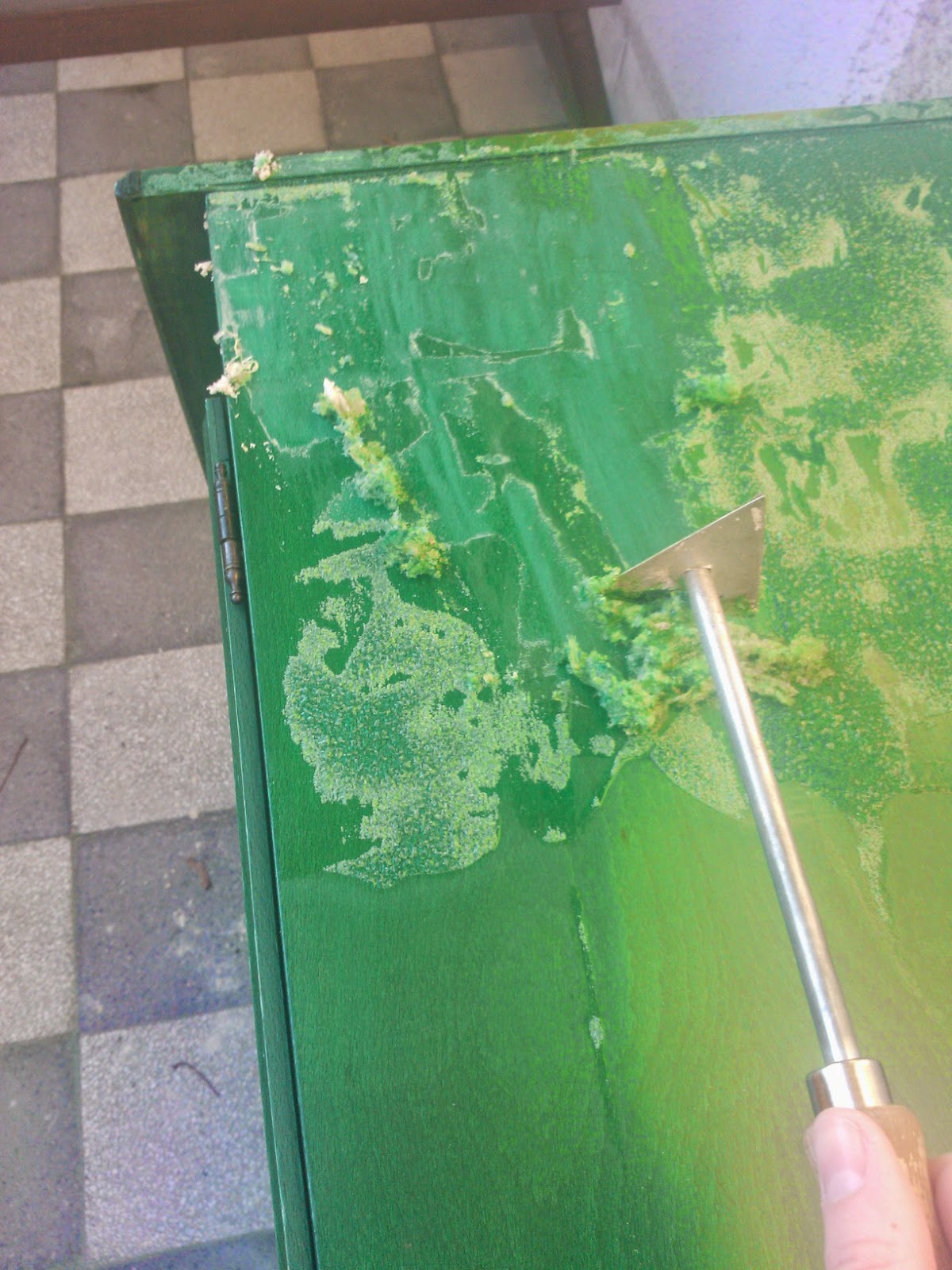 Aztán mikor jobb lett az idő, magamhoz vettem a szükséges hozzávalókat: az öcsémet és két kést, illetve sok kitartást, és nekikezdtünk a lakk-kaparásnak. A lakk eltávolítását így a lehető legbarbárabb módon oldottuk meg, késsel, erővel, és idővel. Ezt a módszert abszolút senkinek nem ajánlom, nem csak azért mert nagyon sok ideig tart, hanem azért is, mert nagyon könnyen meg lehet sérteni a fát, és nem lesz igazán szép az eredmény. Mi azért csináltuk a tetejét mégis így, mert a lakkoldószert, amit vettem (kamu kromofág), kipróbáltam az ebédlőasztalon, és azon nem igazán működött, ezért úgy gondoltam, ezen sem fog. Mint később kiderült, ezen – az asztallal szemben – működött, valószínűleg azért mert kevésbé régi és kevésbé vastag lakkról volt szó ebben az esetben.