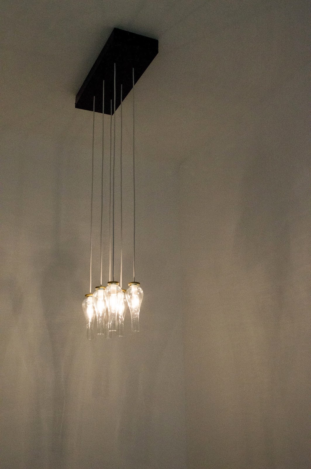 Mielőtt viszont felpakoltuk az egészet a plafonra, a hat vezetékre fel kellett fűzni a “csodaszerkezetet”, aminek köszönhetően nem esnek le az üvegek. Ez pedig sok gondolkozás után 6 db, pont a lámpa nyakára illő befőttesüveg kupak lett, aranyszínűre fújva, és több helyen kilyuggatva, illetve 6 db műanyag palack levágott nyaka (a csavaros részt is levágtam – kenyérvágó géppel, barbár módon). A palack levágott része tökéletes a célra, mivel átlátszó, így alig lehet észrevenni, be lehet gyömöszölni az üvegbe, mivel hajlékony, viszont nem olvad meg. A befőttesüveg kupakja pedig lezárja a tetejét az üvegnek, így a por nem megy be, viszont a lyukak miatt szellőzni tud. Ezután már csak az égők becsavarása, és az üvegek felhelyezése volt hátra.