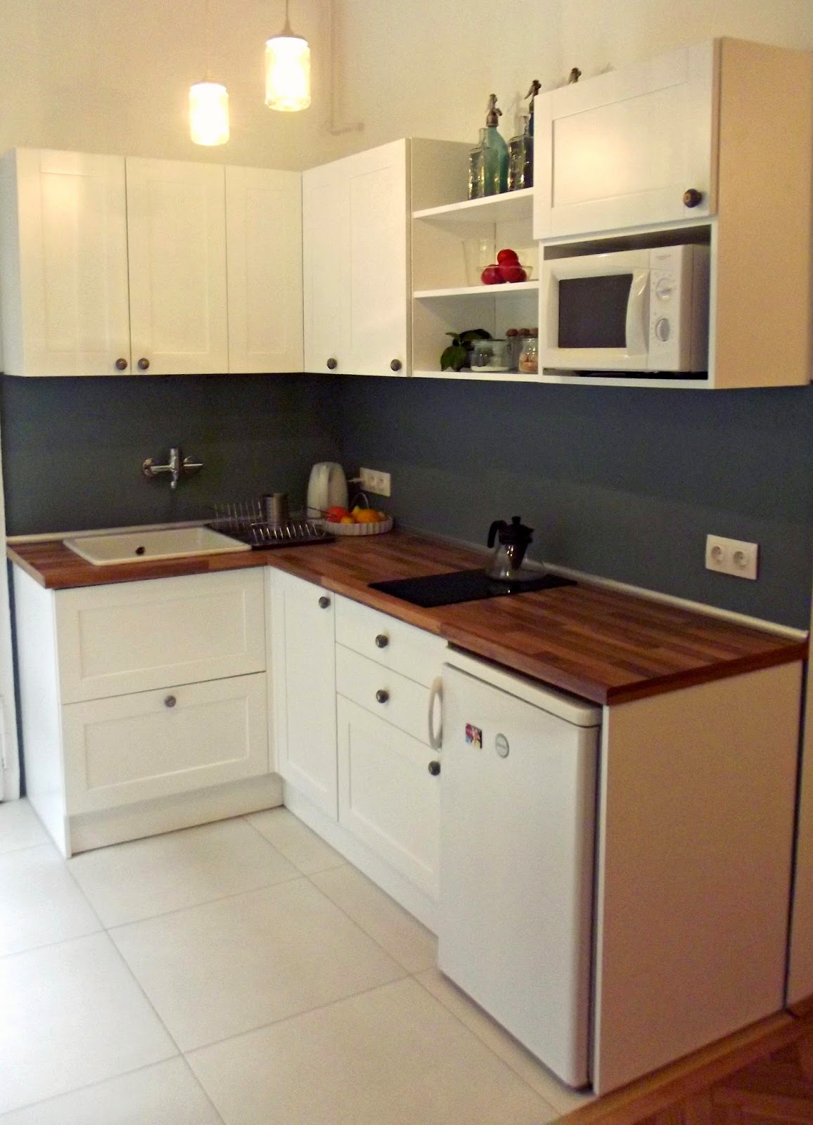 A konyha a látszat ellenére nem az Ikeából származik, hanem az én terveim alapján készítették el, de az ára kb. egy Ikea konyháéval lett egyenlő. A hűtő és a mikró sem beépített (sajnos) de mivel mindkettőt itt hagyta az előző tulaj, ezért nem volt színünk kidobni erre pénzt, mikor tökéletesen működnek.