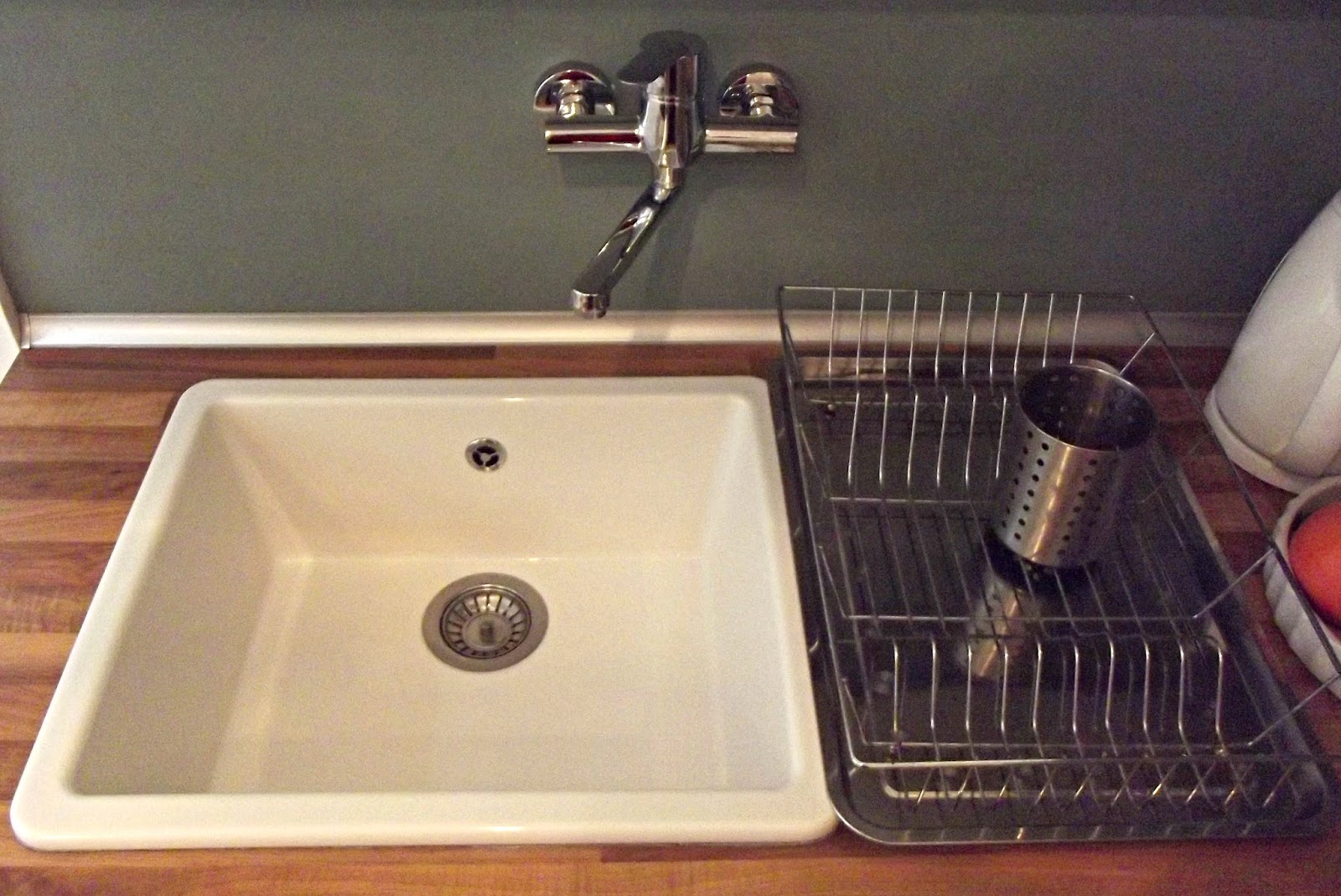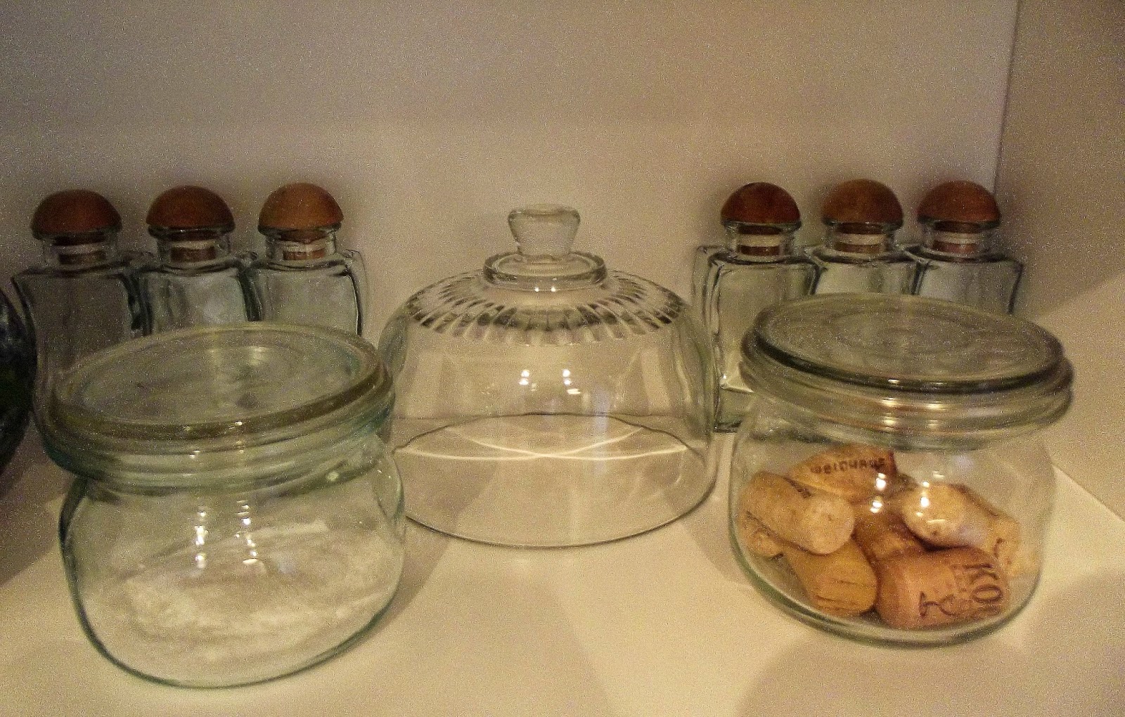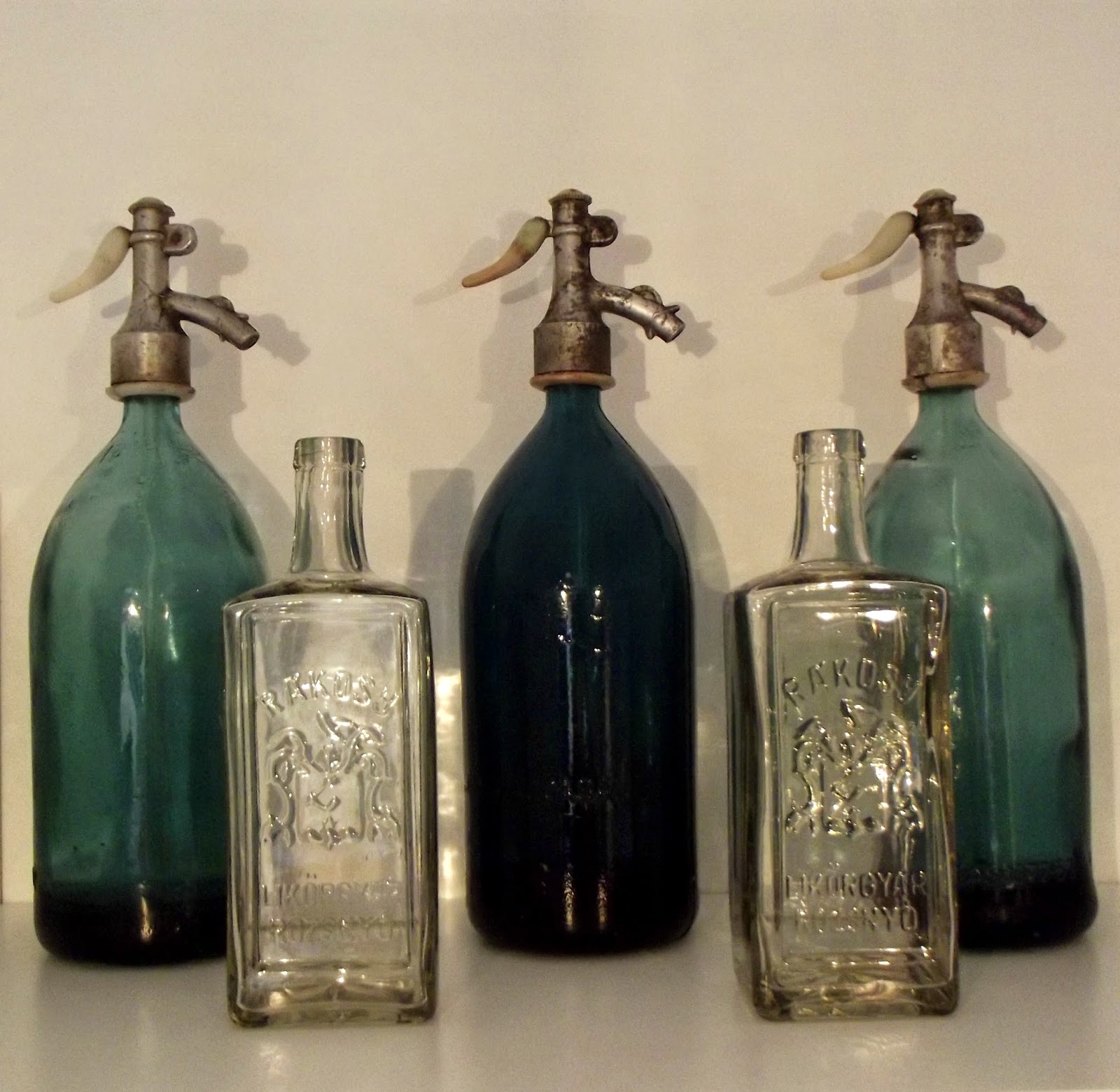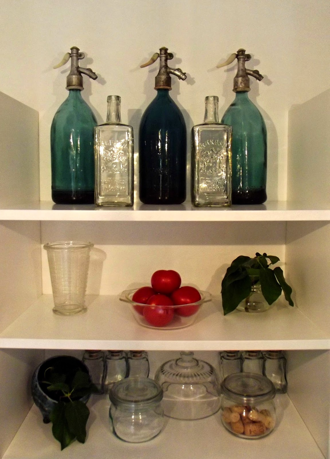 Nem tudtam ellenállni az IKEA porcelán mosogatójának, szóval bekerült a konyhába. Dekorációnak régi befőttesüvegeket, szerintem nagyon szép színű régi szódásüvegeket és titkos helyről beszerzett nagyon régi italos üvegeket használtam (az üvegeken a Rákosy likőrgyár Rozsnyó felirat díszeleg, ami azért érdekes, mert Rozsnyó már jó ideje Szlovákiához tartozik). A nyitott polcokon a dekoráción kívül a sót, fűszereket, néha zöldségeket, gyümölcsöket, és nagymamám testvérétől származó üveg mércéspoharat tartok.
