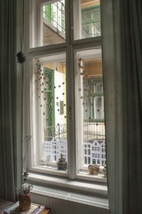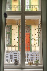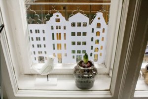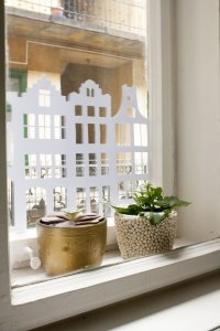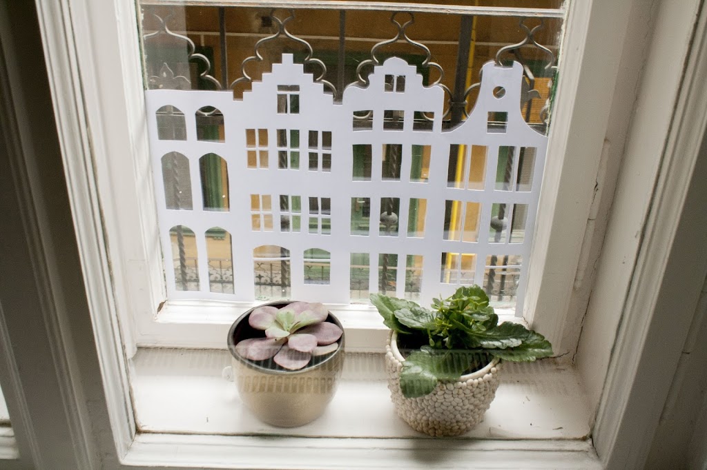 Az “ablak aljába házikókat” című ötletet a Pinteresten láttam, de azt hiszem az amszerdami házikós ötlet már az enyém volt. Ehhez mint fentebb írtam, műszaki kartont használtam, amit jobban szeretek, mivel vastagabb mint a hagyományos nyomtatásra használt papír, ezért ellenállóbb, kevésbé gyűrődik, kevésbé látszik át és szebben lehet belőle dolgokat kivágni. Ha leméritek az ablakotokat, majd a megfelelő méretben házikókat rajzoltok vonalzóval – én fotó alapján csináltam – akkor ezt fogjátok kapni. Az előre megrajzolt mintát kell sniccerrel kivágni. A megrajzolással együtt kb. fél óra megcsinálni egyet. A rögzítéshez a celluxot kis gyűrű alakba hajtottam ( ragacsos oldallal kifelé), és ennek segítségével ragasztottam az ablakra. A vastag papír előnye, hogy valószínűleg nem fog elszakadni, mikor leszedem az ablakról, így valószínűleg jövőre is használni fogom.