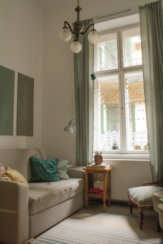 Ezen a képen (ami egyébként jó szemcsés, meg kéne tanulnom fotózni) felhívnám a figyelmet egyrészt a csodás csillárra, amiről már múltkor írtam, másrészt pedig a gyönyörű sötétkék díszpárnámra, melyet Viki barátnőm varrt nekem. Az anyag az Emese szobájába készült szék kárpitozásából maradt, és nagyon szeretem, mert színjátszós 🙂 A kedvenc függönyeim, melyek anyagköltsége kb. 7000 Ft volt, szintén Viki munkáját dicsérik (illetve az egyszínű sárga és a hátsó kék díszpárna is). Még megemlíteném az Ikea Tertial lámpáját is, ami kikandikál a függöny mögül. Az eredetileg is kedvező árnál is kedvezőbben, 1000 Ft-ért vettem használtan, és bár nem magamnak vettem, de végül megtartottam, mert így végre van olvasólámpa, és be lehet kuckózni teával meg könyvvel, meg hajnalban vizsgaanyaggal, szóval tök jó. A “dohányzóasztal” nem a szívem csücske, de jelenleg funkcionálisan megfelel, és nagyobb gondom is van jelenleg mint utánpótlást keresni, de egyszer biztos annak a lecserélése is sorra kerül. Remélhetőleg még tudok írni január végéig is néha-néha, de az igazi visszatérést februártól tervezem. Nagyon izgalmas dolgok lesznek: lakásfelújítás, bútorfelújítások a műhelyből, és még sok egyéb, szóval ne hagyjatok el a hallgatás ellenére sem! 🙂