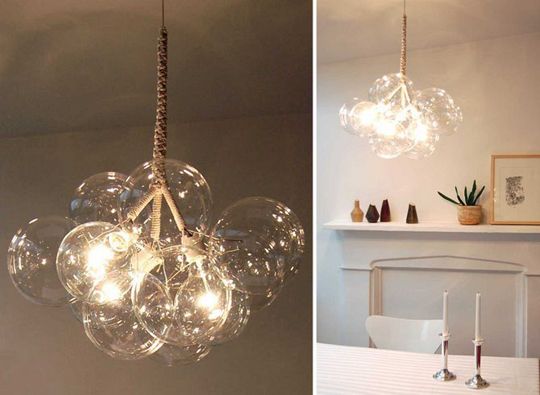 Nagyon édes ez az üveggömbös csillár, ami jól mutathat lányszobákban, de ha elég üveggömböt használunk, akár egy nappaliban is.Elkészítése nem túl bonyolult, viszont az üveggömböket gyors kutatáson alapján úgy tűnik csak innen lehet beszerezni: http://www.cb2.com/bubble-spheres-clear/f4820?c=527&f=4820&q=bubble+balls&fromLocation=Search&DIMID=400001&SearchPage=1&aff=cj