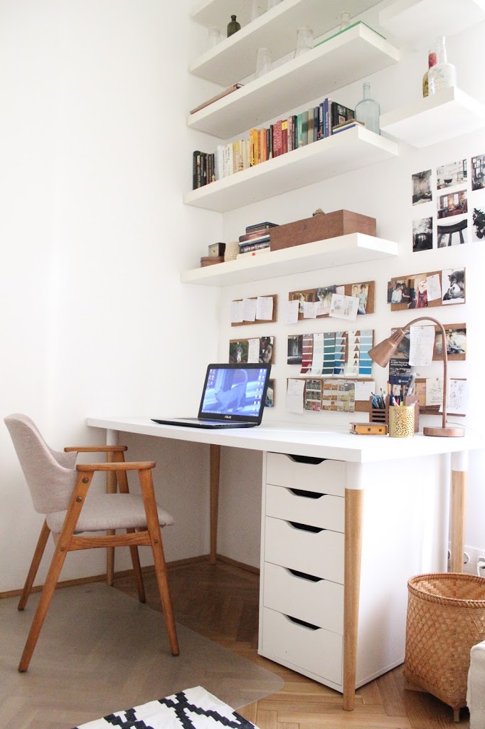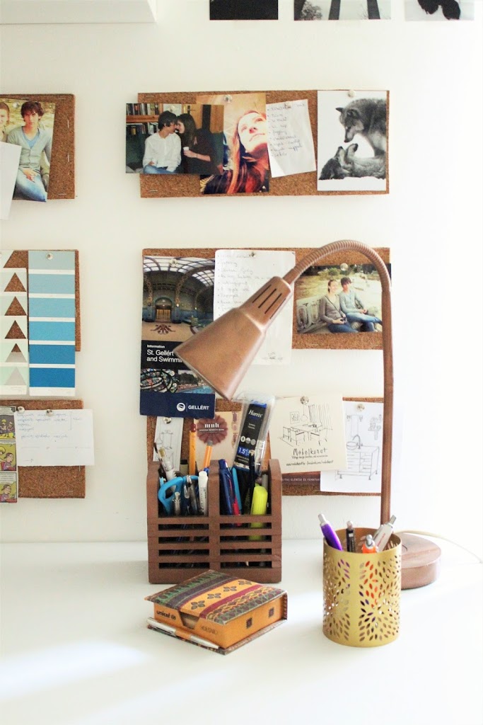 Mikor beköltöztem, otthonról hoztam az asztalt és a forgószéket, mindkettő Ikeás. Az asztal már kopott volt, így fehér öntapadós fóliával vontam be, ami elég jó ideiglenes megoldás, és nagyon olcsó is. A lábakat egy ponton lecseréltem mcm jellegű lábakra, a korábbiakat pedig eladtam. A lámpát, és egy lomizott fenyő evőeszköztartót átfújtam vörösrézre sprayfestékkel. A széket 18. születésnapomra kaptam, és nagyon szerettem… amíg nem üldögéltem benne hosszabb ideig. Rettentően kényelmetlen, bármilyen szép is! Így mikor lomiztam egy szép formájú retró széket, elhatároztam, hogy ez lesz az utód.