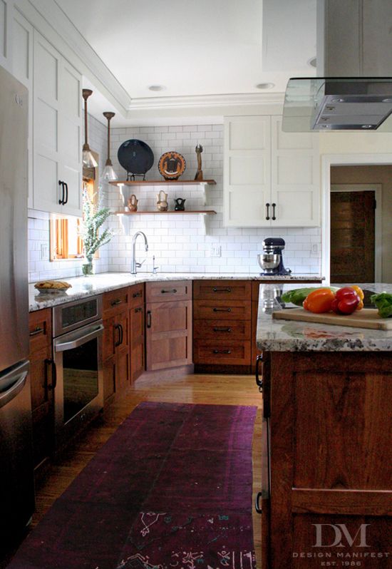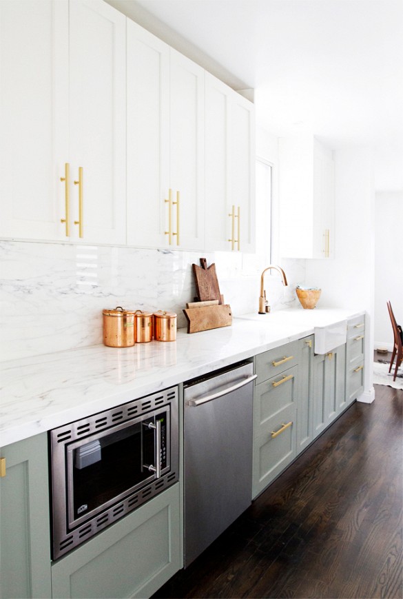 Egy ideje már nagyon tetszik ez a trend, ahol az alsószekrények valamilyen színt kapnak, míg a felsőszekrények fehérek maradnak. Ennek több előnye is van: a sötétebb színű alsószekrények kevésbé koszolódnak, illetve a fehér felsőszekrények kevésbé nyomják össze a teret, mintha azok is a sötétebb színt kapták volna. Fekete, kék, szürke, zöld? Bármelyik szín jöhet, a fehér felsőszekrényekkel kombinálva nem lesz “túl sok”! A dolog nem csak színnel, hanem fafronttal is szépen működik.