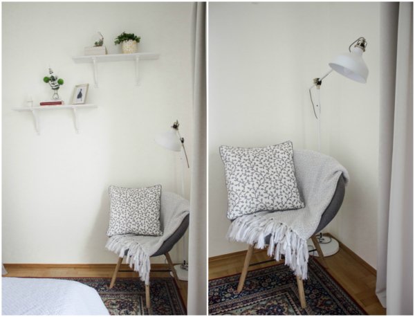 Az éjjeliszekrényeket a jófogásról vadásztam, diófa furnérosak és szerintem gyönyörűek, ráadásul rengeteg tárolóhelyet biztosítanak. A fotel Jysk-es, az éjjelilámpák a jól bevált Ikeás Ranarp-ok.