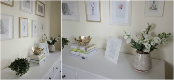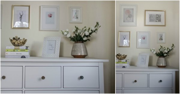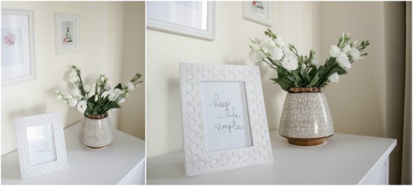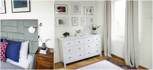 A fehér komódon lévő vázát a BÁV-ban vettem, a többi kiegészítő, mütyür, képkeret és párna pedig a H&M Home-ból, az Ikeából és a Jísk-ből vegyesen érkezett.