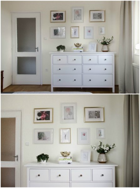 A nagy ruhásszekrény átkerült a gardrósszobába, helyére pedig bekerült egy Ikeás Hemnes komód bolhapiacról származó egyedi kis foganytúkkal (100 Ft/db volt, ha jól emlékszem)