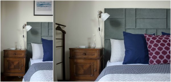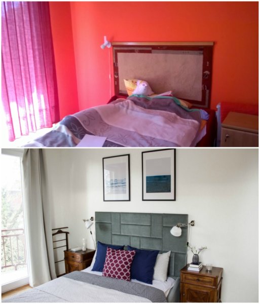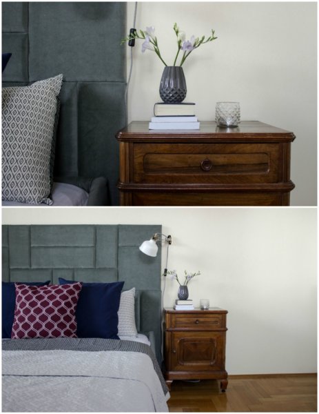 Az ágyat nem változtattuk meg, de átkárpitoztuk a karetét, és gyártottunk hozzá egy paneles felépítésű ágyháttámlát. Ennek részleteit itt láthatjátok: https://bergerinterior.cafeblog.hu/2015/04/17/haloszoba-karpitozott-fejtamlaval-turbozva/ Ez a háttámla mégis ezerszer jobb lett mint a saját hálószobámban lévő, mégpedig két dolog miatt: