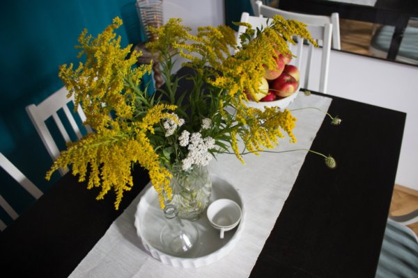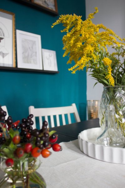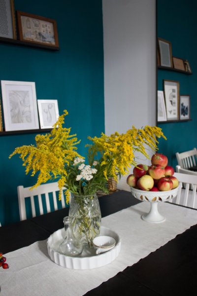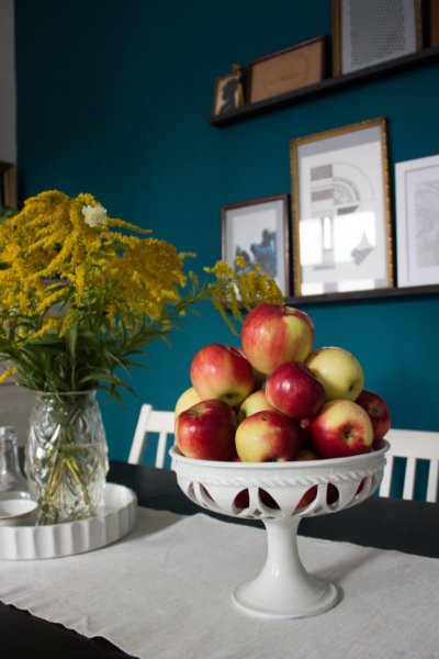 Tegnap ünnepeltük nagypapám nyolcvanadik születésnapját egy nagyon finom családi ebéddel. Utána elmentünk anyával sétálni, és szedtünk pár cipkebogyót és egyéb gazt, amivel kicsit kidekoráltam az ebédlőt. A dekoráció ehető része a nyírségi, elképesztően finom jonatán alma nagymamámék kertjéből.