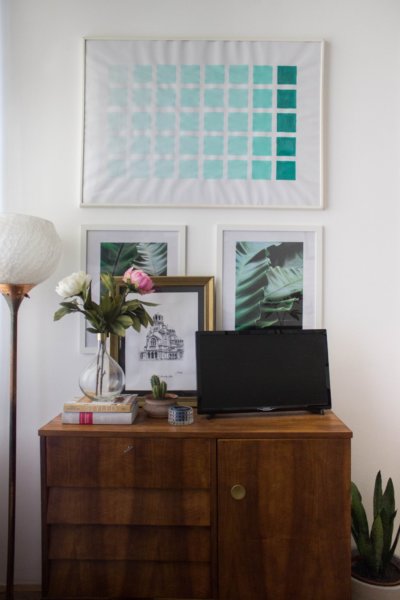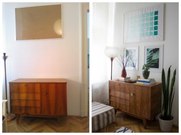 Aztán a szoba másik oldalán itt a csodaszép retró komódom, amit barátnőmtől kaptam ajándékba, és aminek a felújításával nagyon sokat szenvedtem, de nagyon szeretem, megérték a vízhólyagok. Az állólámpát nagymamám vette valamikor a hetvenes években egy iparművészeti vásáron. Ennek később még jelentősége lesz…