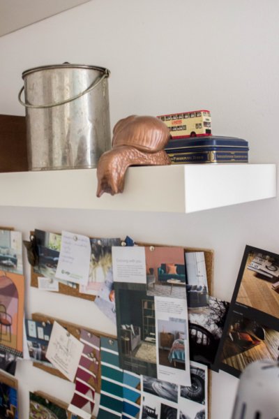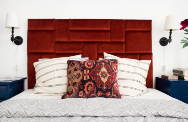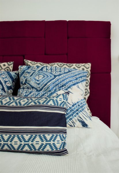Eredetileg tűzött háttámlát akartam az ágyhoz (Ikea Brimnes ágyneműtartós ágy, nagyon szeretem mert lehet bele pakolni sok-sok mindent), de aztán a Living Etc-ben láttam egy Sofa&Chair Company hirdetést, ami elrabolta a szívem, így lemásoltam tőlük ezt a több darabból álló háttámlát. Ekkor még nem tudtam, hogy a szivacsok szélét be kéne vágnom 45 fokban, így nem dobta ki olyan szépen a mintázatot, plusz az anyag sem volt ideális választás, mivel ez egy már meglévő Ikeás Indira ágytakaró volt, ami anyagában csíkos, így nagyon kellett figyelni a kárpitozásnál. De azért a háttámlával már sokkal jobb volt az összhatás, de mikor egy másik hálóba bársonnyal kárpitoztam egy ugyanilyen háttámlát már 45 fokban bevágott szivacsokkal, akkor tudtam, hogy eljön majd annak is az ideje, hogy a sajátomat is tökéletesítsem.