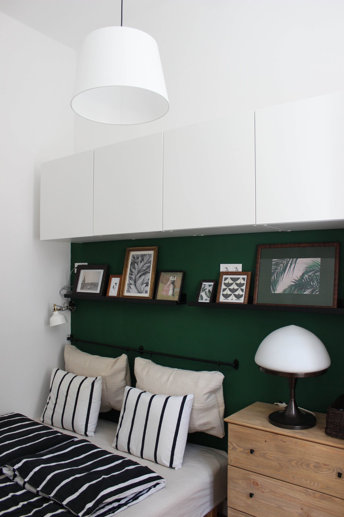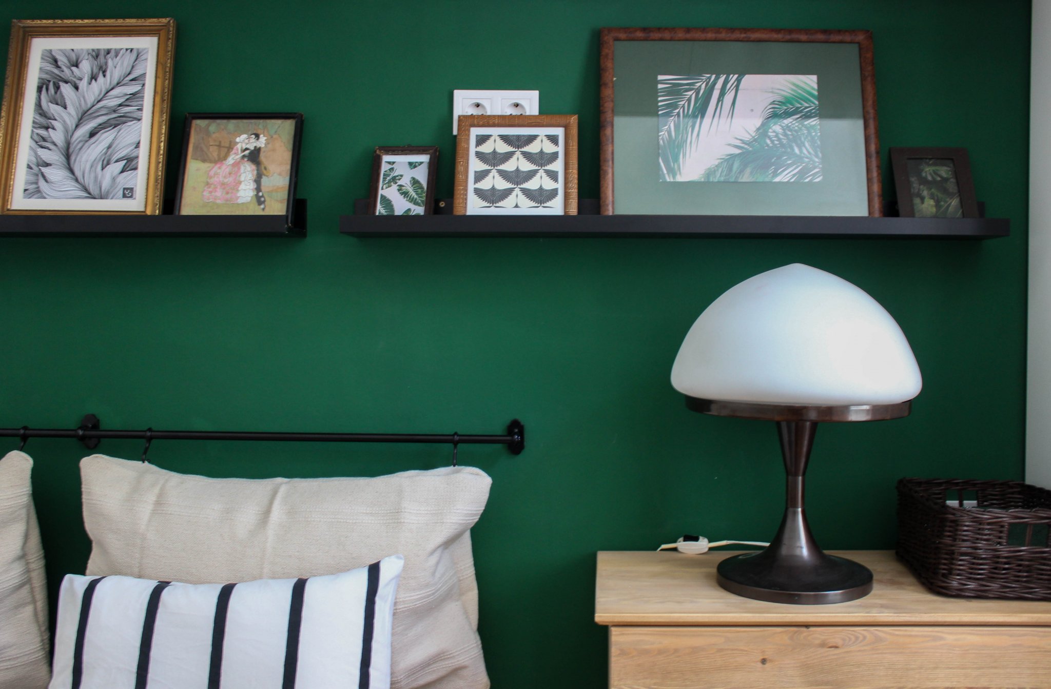Ami itt nekem a szívem csücske az a sötétzöld fal a képekkel, illetve az antik éjjelilámpa, amit a Jófogáson lőttem.