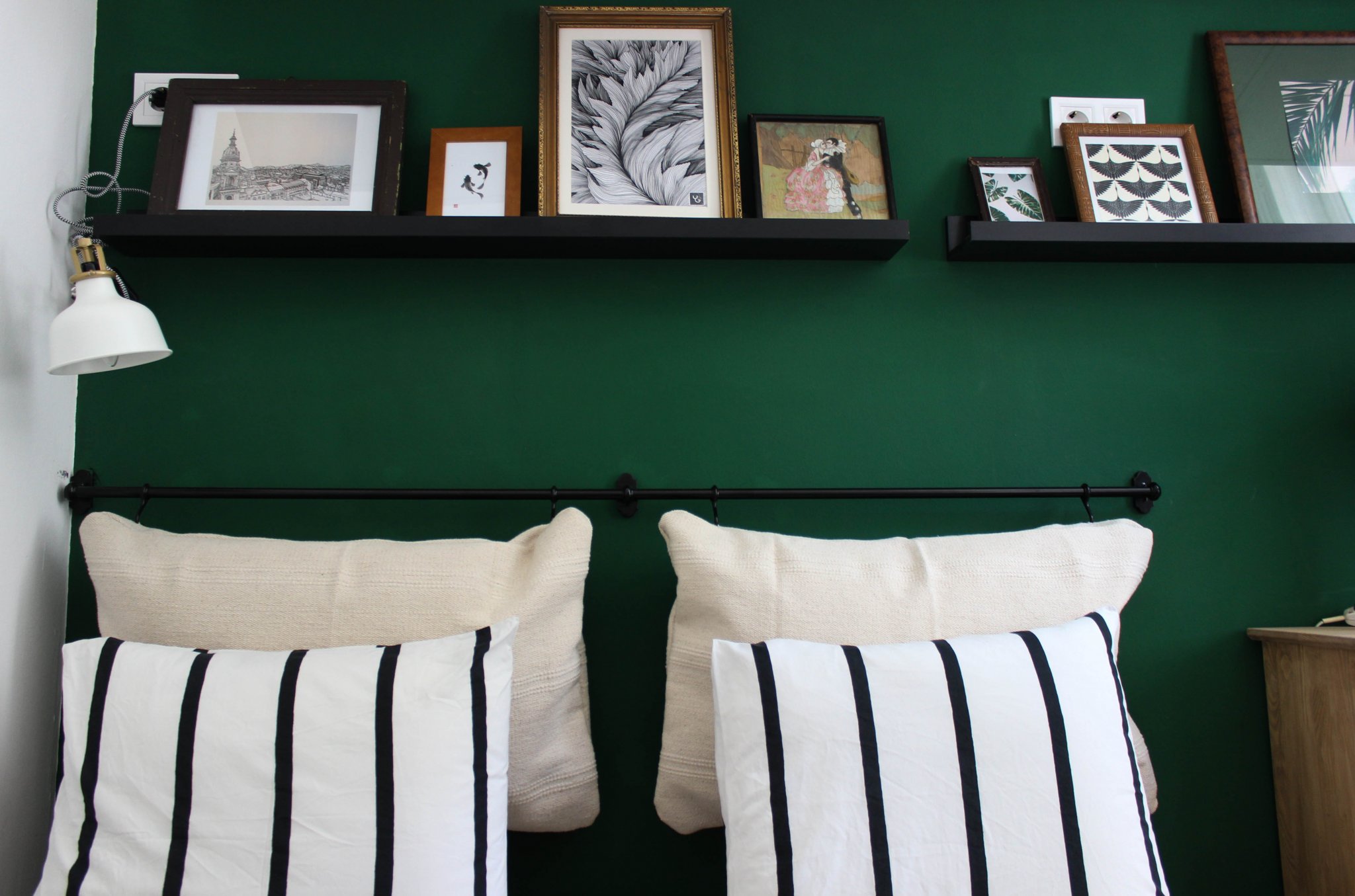 A képkereteket én mindenhonnan gyűjtögetem, ami ilyenkor nagyon jól jön, mert egész könnyen össze tudok dobni egy vegyes válogatást a kis titkos készletemből. Az ágy fejtámla teljes DIY projektből Ikea hackké egyszerűsödött, mikor rájöttem, hogy a konyhai akasztós rúd (Fintorp) ideális a céljaimhoz minden szempontból.
