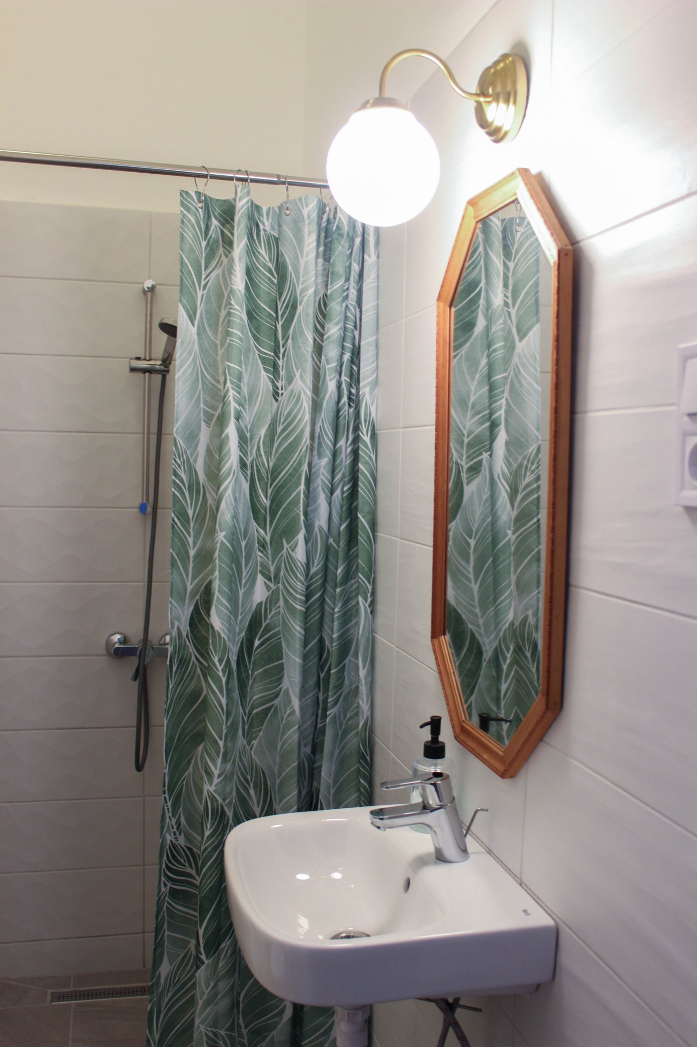 A fürdőben 20×60 cm-es fehér matt, kissé texturált csempéket használtunk a falon, a földön pedig világosszürke, kő mintázatú 30×60-as greslapot. A mosógép helyét nem fotóztam, de a zuhanyzótol balra az is helyet kapott, felette polcokkal.