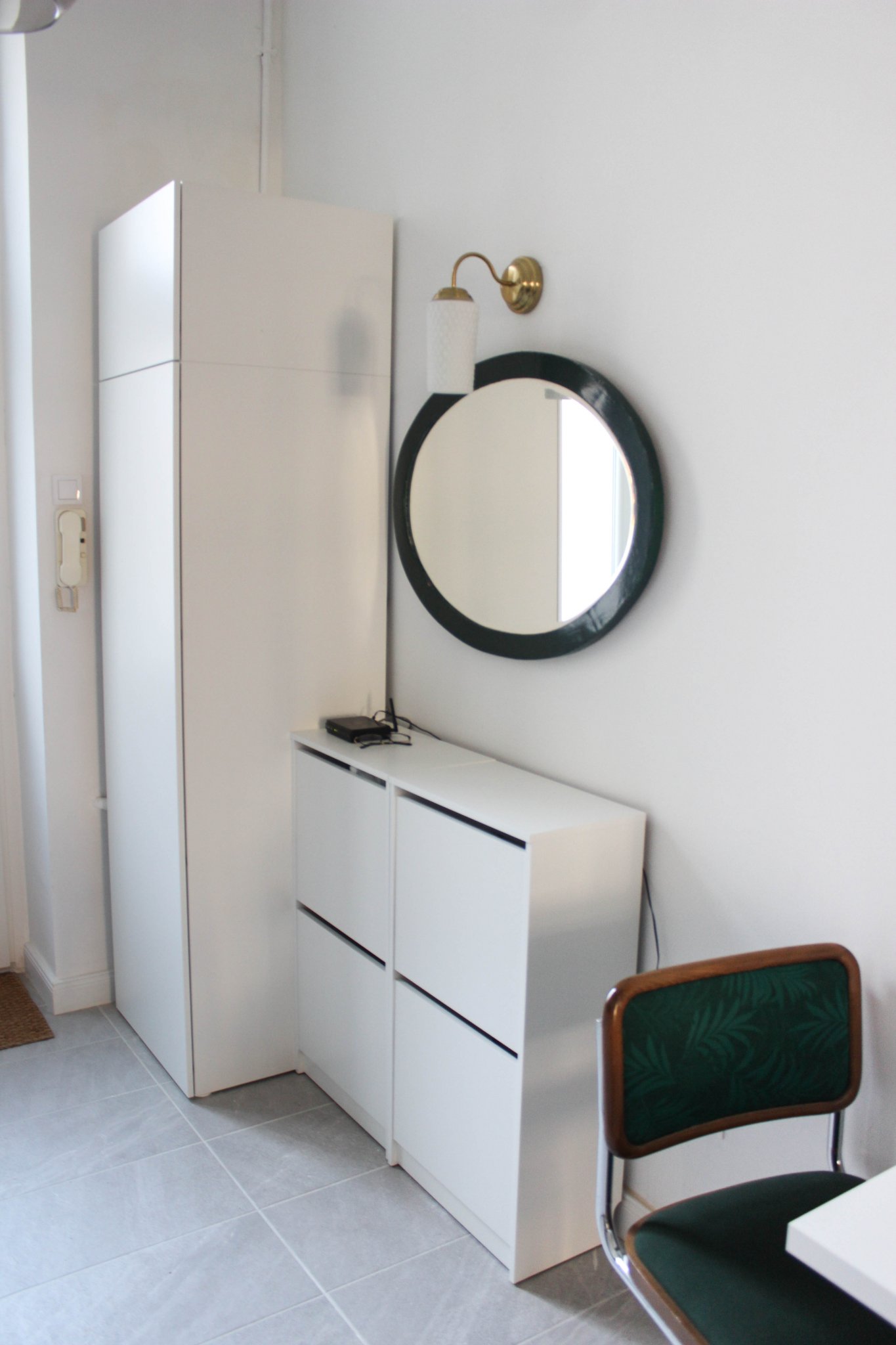A falikar buráját lomtalanításon szereztem, szerintem nagyon feldobja az amúgy egyszerű Ikeás lámpatestet. Az óriási sötétzöld fa keretes tükör Jófogás, és nagyon jól mutat itt.