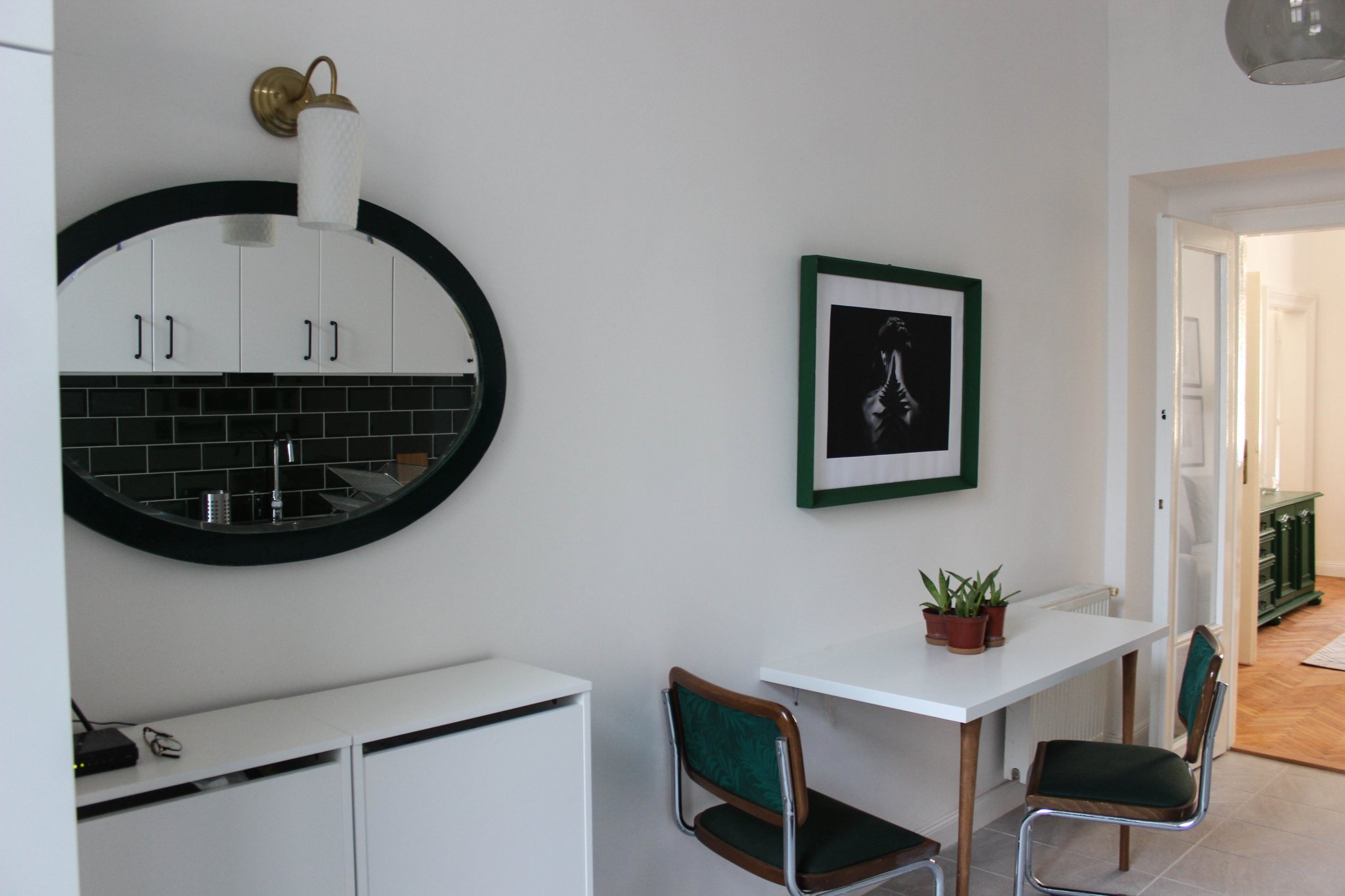 A komód fölé a fényképek készítésekor még nem került fel a retró polc, így elég üres a komód fölötti rész, de képzeljétek oda 😀