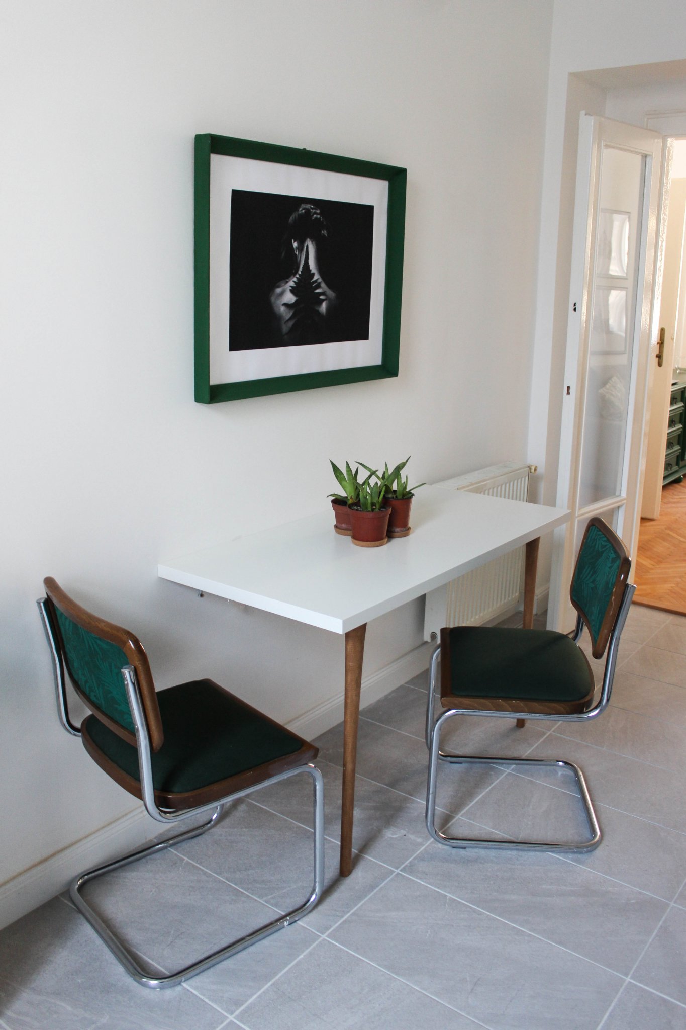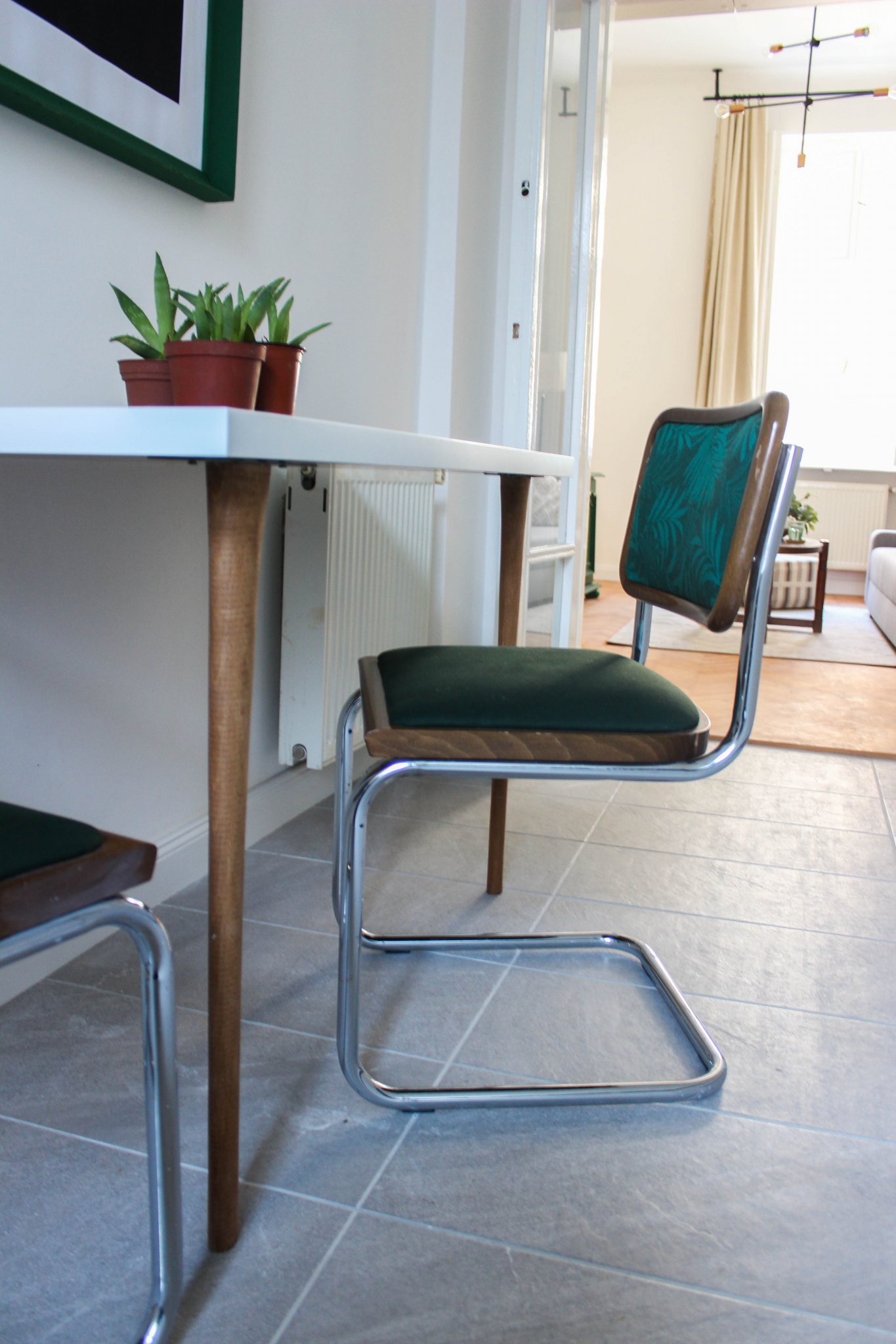 A Breuer Marcell-féle Cesca szék koppintásokat Jófogáson vettem, de át lettek kárpitozva, így tökéletesen illenek a koncepcióba.
