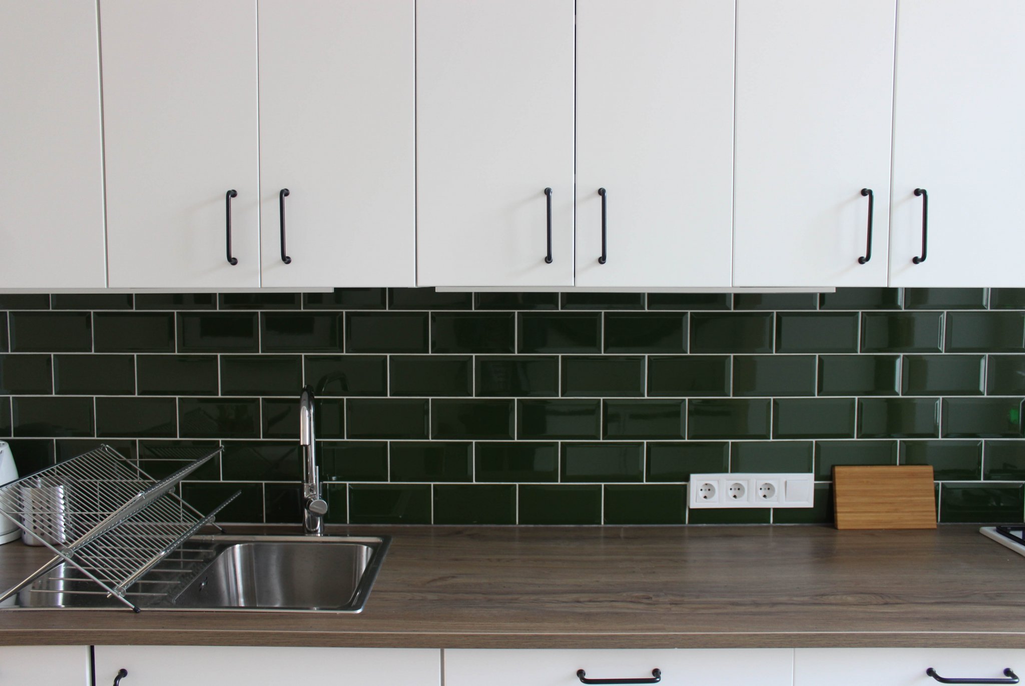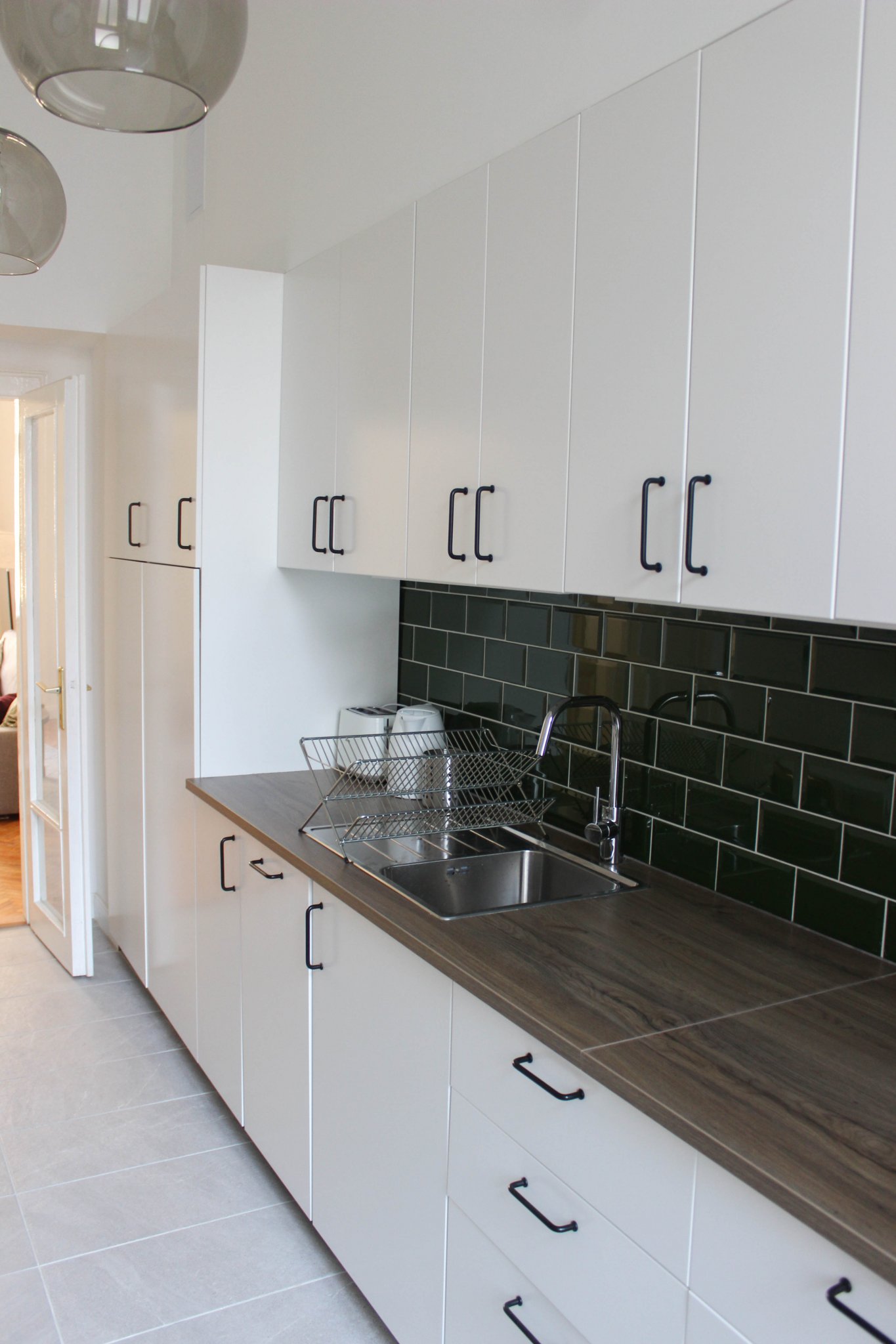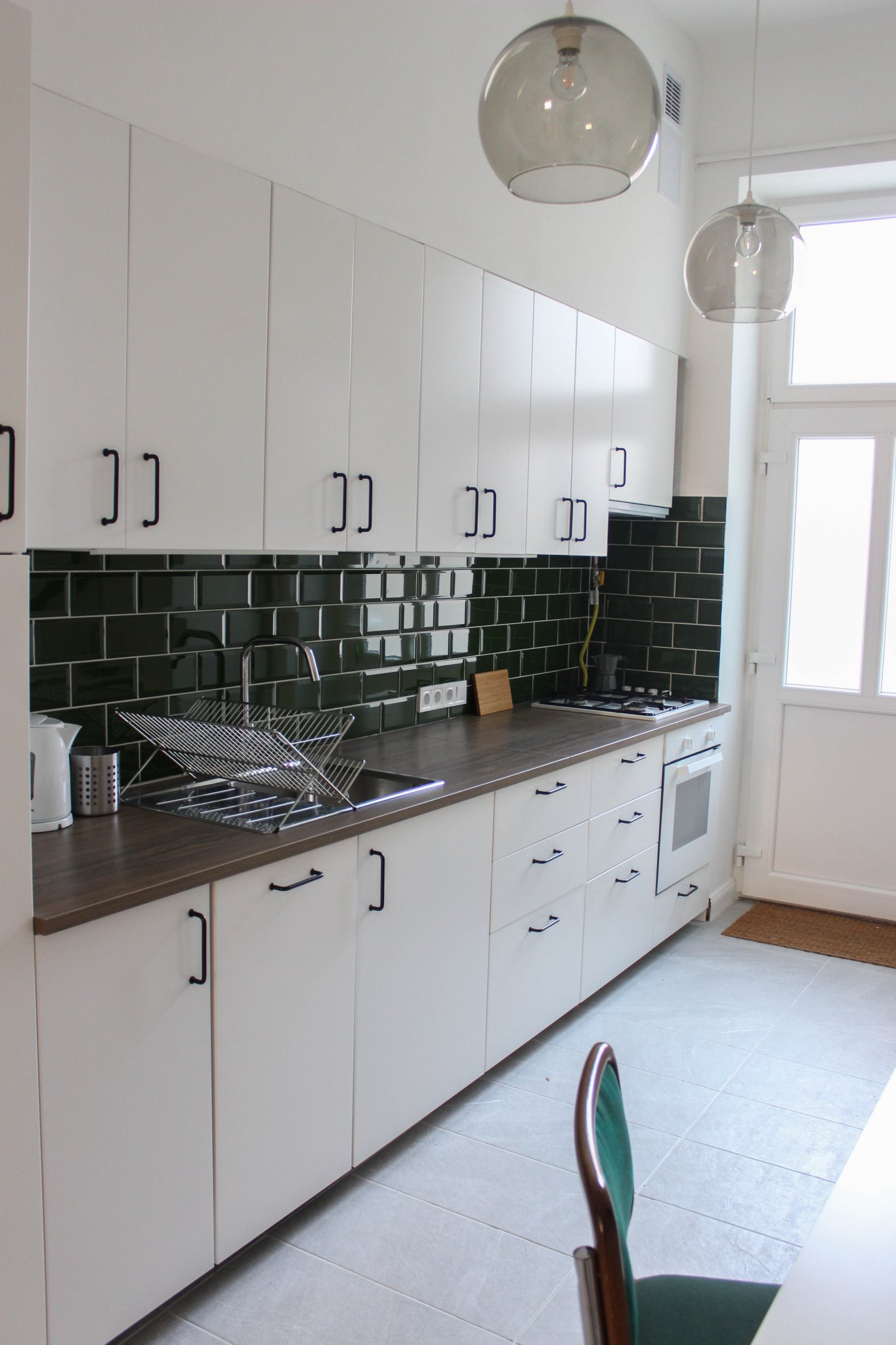 A konyha nagyon egyszerű, az izgalmat a sötétzöld metrócsempe szolgáltatja. A konyhai gépek beépítettek, és itt is sok tárolót sikerült kialakítani, így van hely pl a felmosóvödörnek, seprűknek, stb. is.